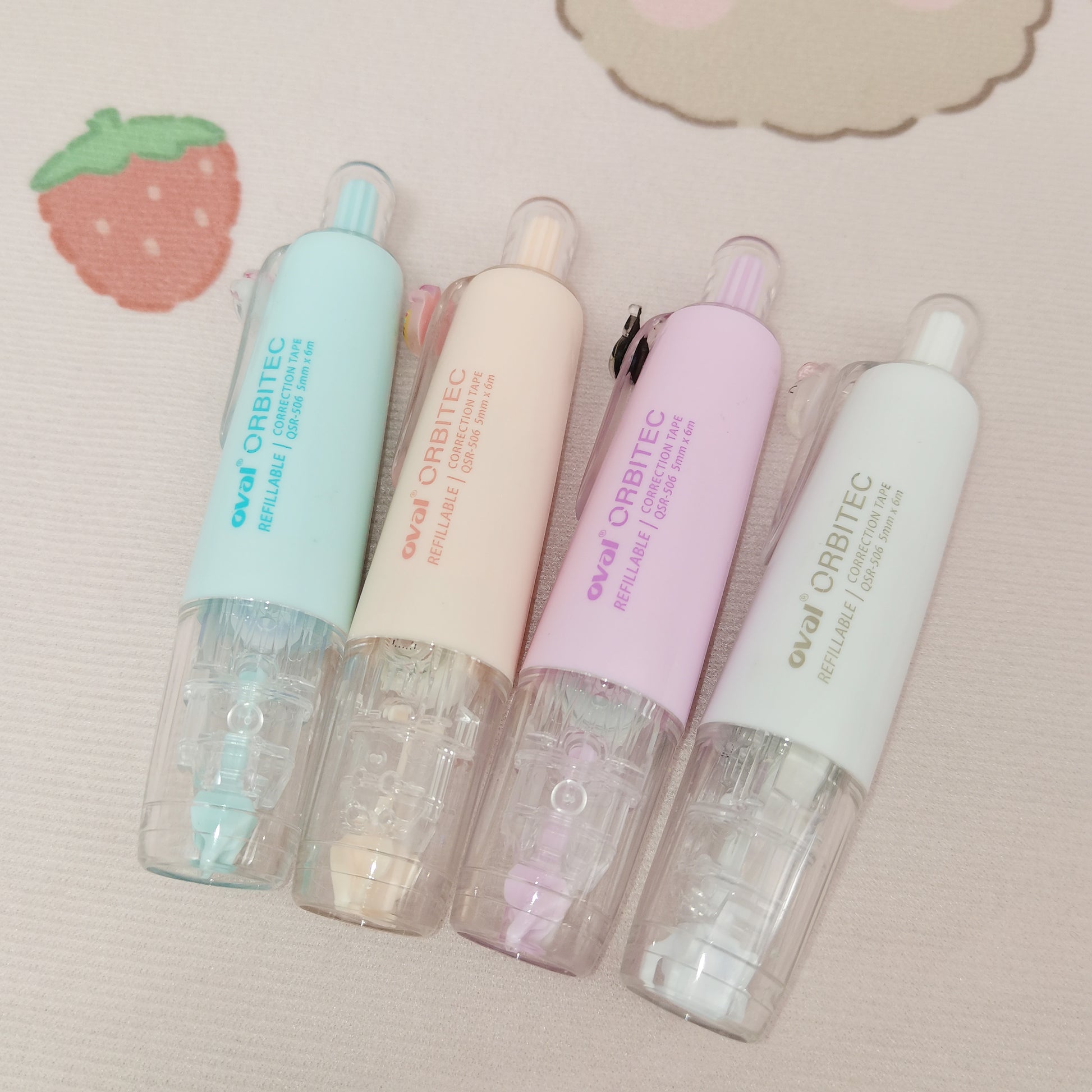 This is the Oval Orbitec Correction Tape, which belongs macaron color limited edition series. The Orbitec is a patented rotating system that provides correction tape that can be applied and adjusted to any angle. The Smootec's refill allowed for a quick and smooth using process. It is refillable, the refill is the same with every Oval refillable correction tape.