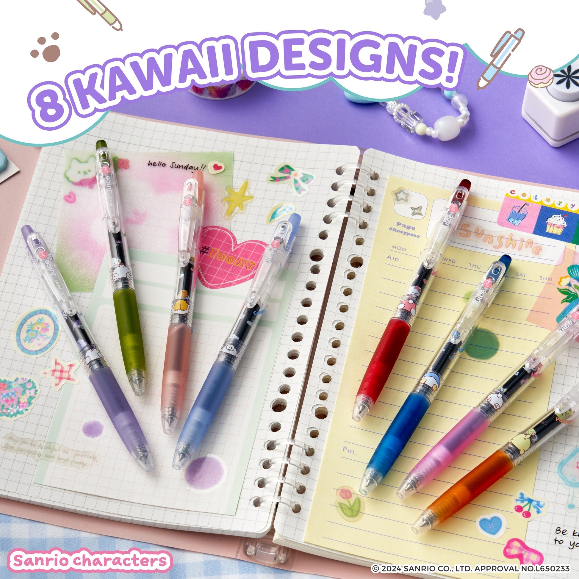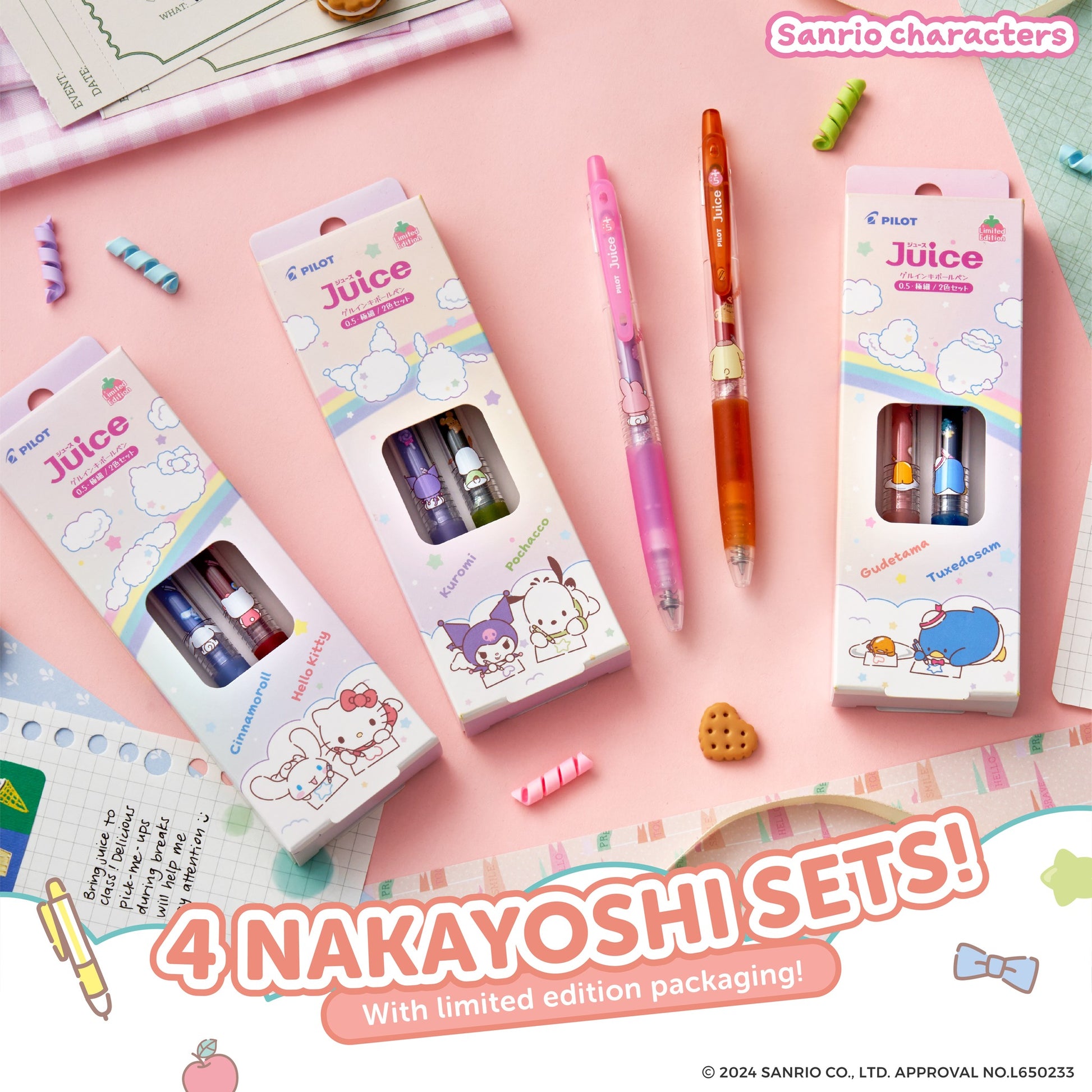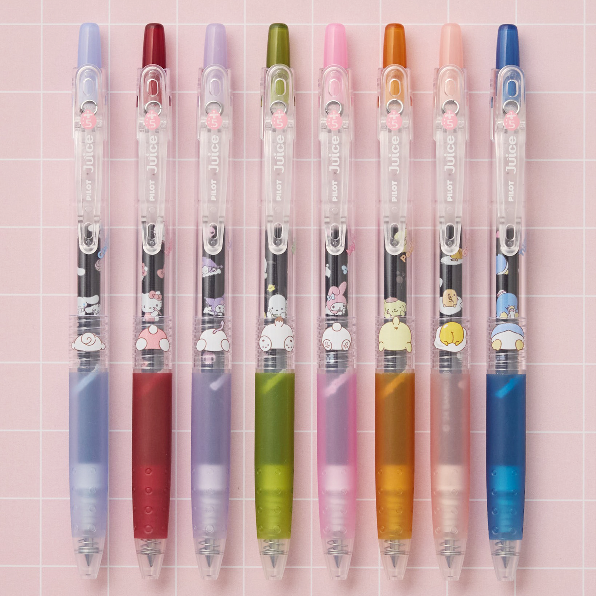 Meet the Pilot Juice x Sanrio Limited Edition Gel Pen Set of 8 – the ultimate treat for Sanrio fans! 🖊️ This 0.5mm Gel Pen set features all your favorite Sanrio friends, including Hello Kitty, Cinnamoroll, Kuromi, My Melody, Pochacco, Pompompurin, Tuxedosam, and Gudetama, each pen showcasing adorable back-view designs of the characters drawing together in harmony. 🎀🌈💖🍭With every click, the rotating ink refill creates a fun, animated effect as each character spins around, adding a bit of magic to every note or doodle! ✨ The black gel ink flows smoothly and dries quickly, so you can write and draw with ease and precision. Plus, each pen refill can be swapped out and used in other Pilot Juice bodies, letting you customize your collection even more! This Sanrio Characters Pen set is a Limited Edition Gel Pen collection sure to add extra joy to every writing moment! 🎀🌸💕