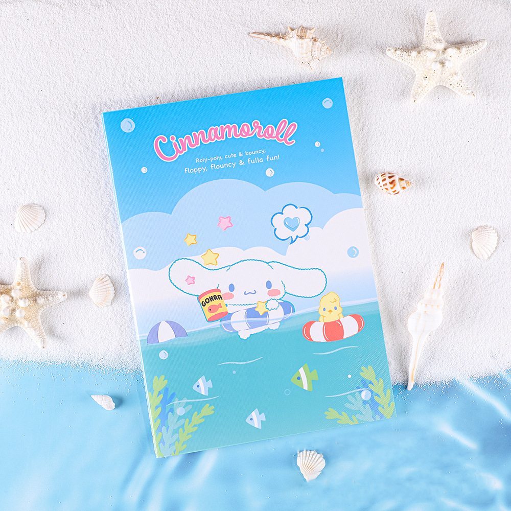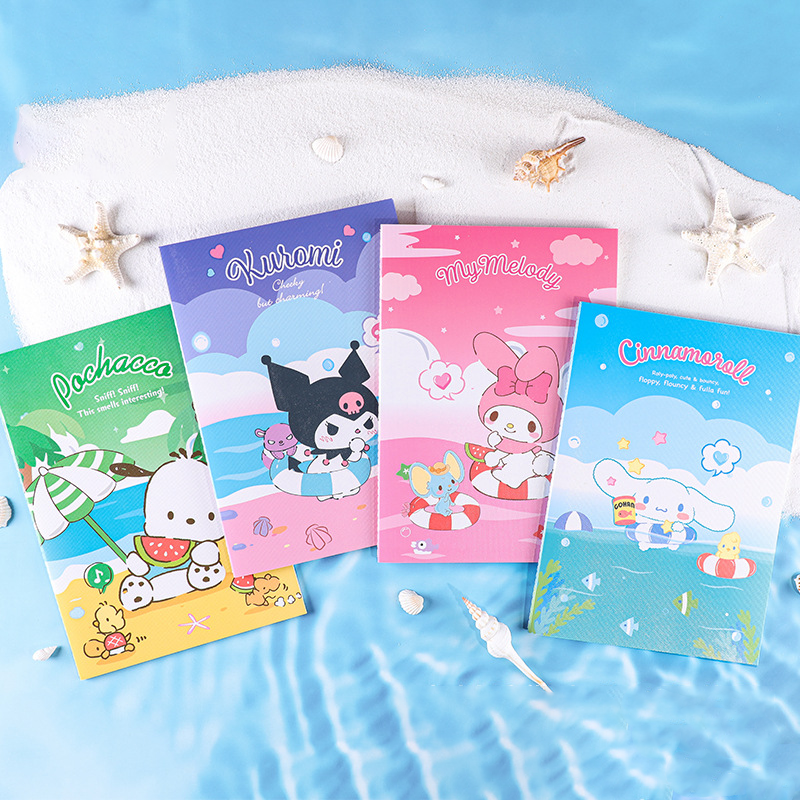 Check out this adorable Sanrio Beach Series Notebook! The cover features cute Sanrio beach-themed prints with an embossed texture, giving it a premium feel while keeping the corners from curling. Each page has a playful Sanrio character design in the bottom corner, adding a fun touch. The notebook includes 32 pages made from 80g double adhesive paper, offering a sturdy and smooth writing experience. This series comes in three designs—Cinnamoroll, Kuromi, and My Melody. Perfect for taking notes, journaling, or creating a planner!