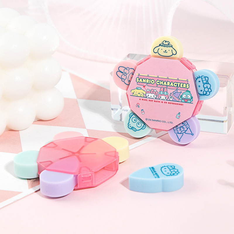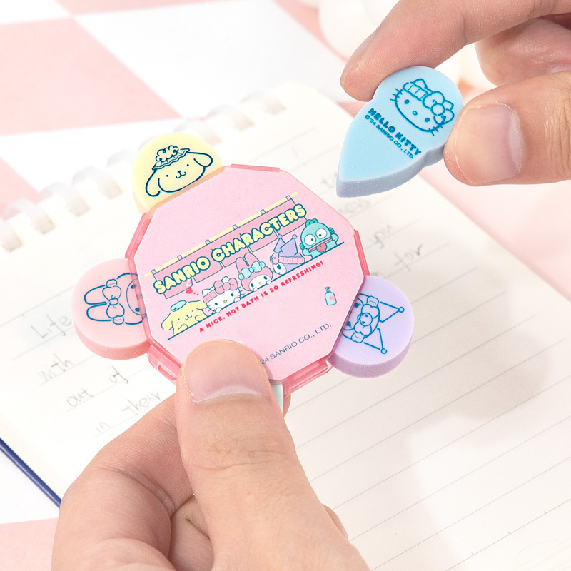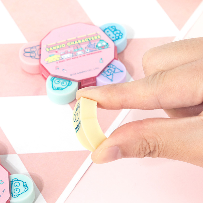 Erase your mistakes in style with this Sanrio Eraser Set! Featuring 5 adorable erasers from your favorite Sanrio characters, there are Kuromi, My Melody, Pompompurin, Hello Kitty, Hangyodon. This set adds a touch of fun to any school or office supplies. Perfect for any Sanrio fan, bring a bit of whimsy to your daily erasing tasks!