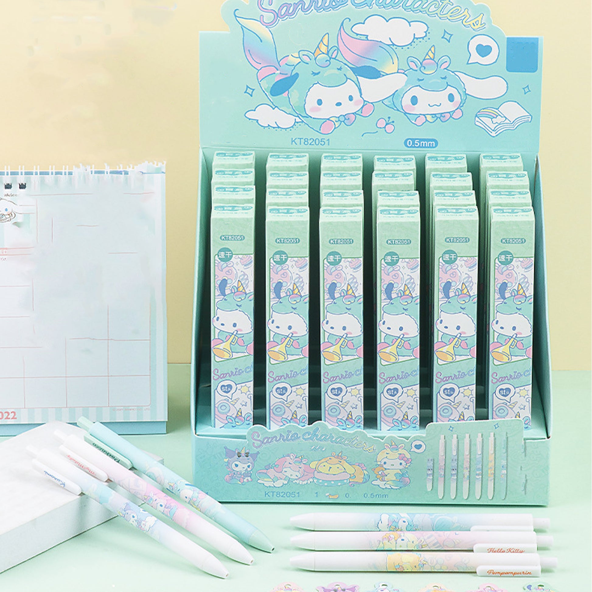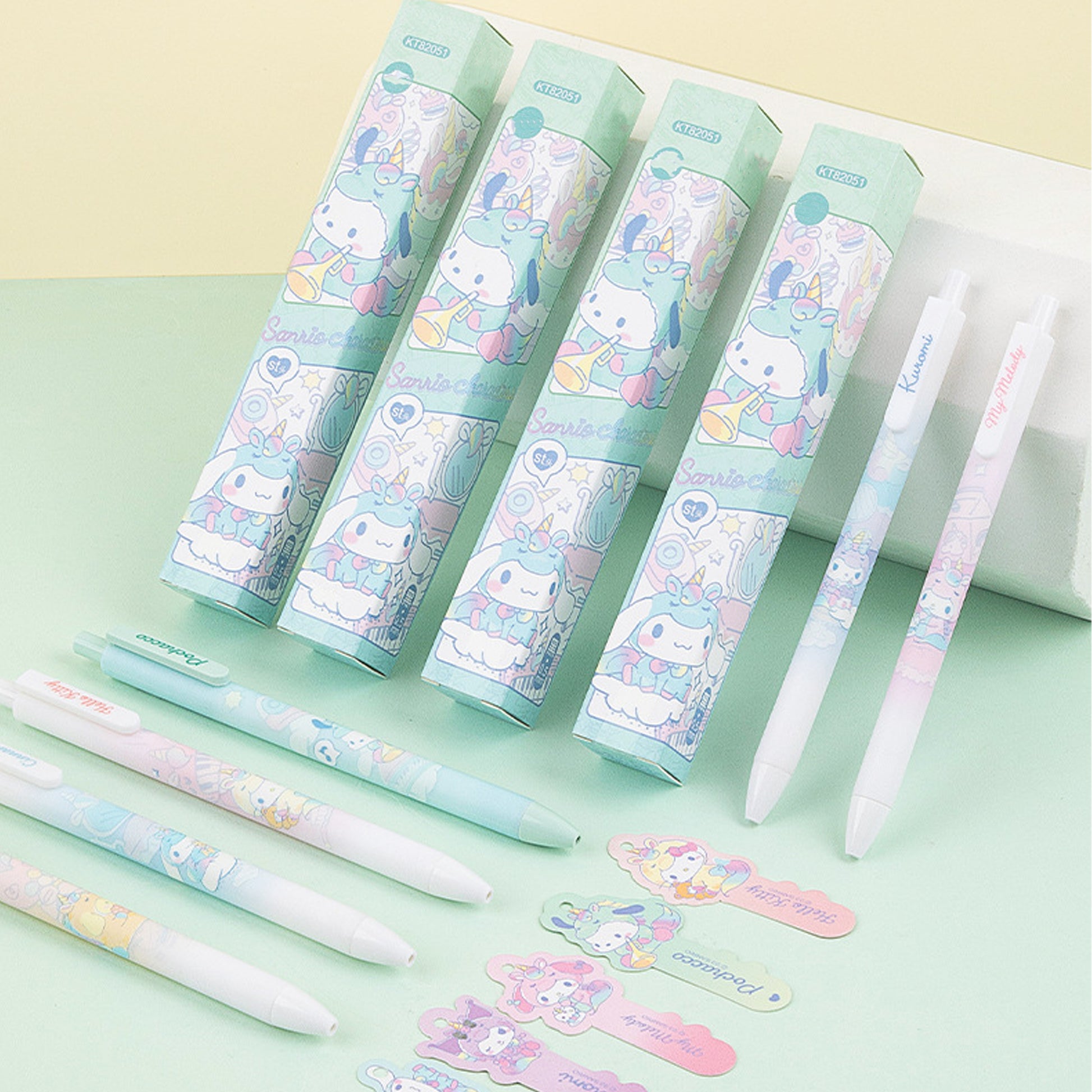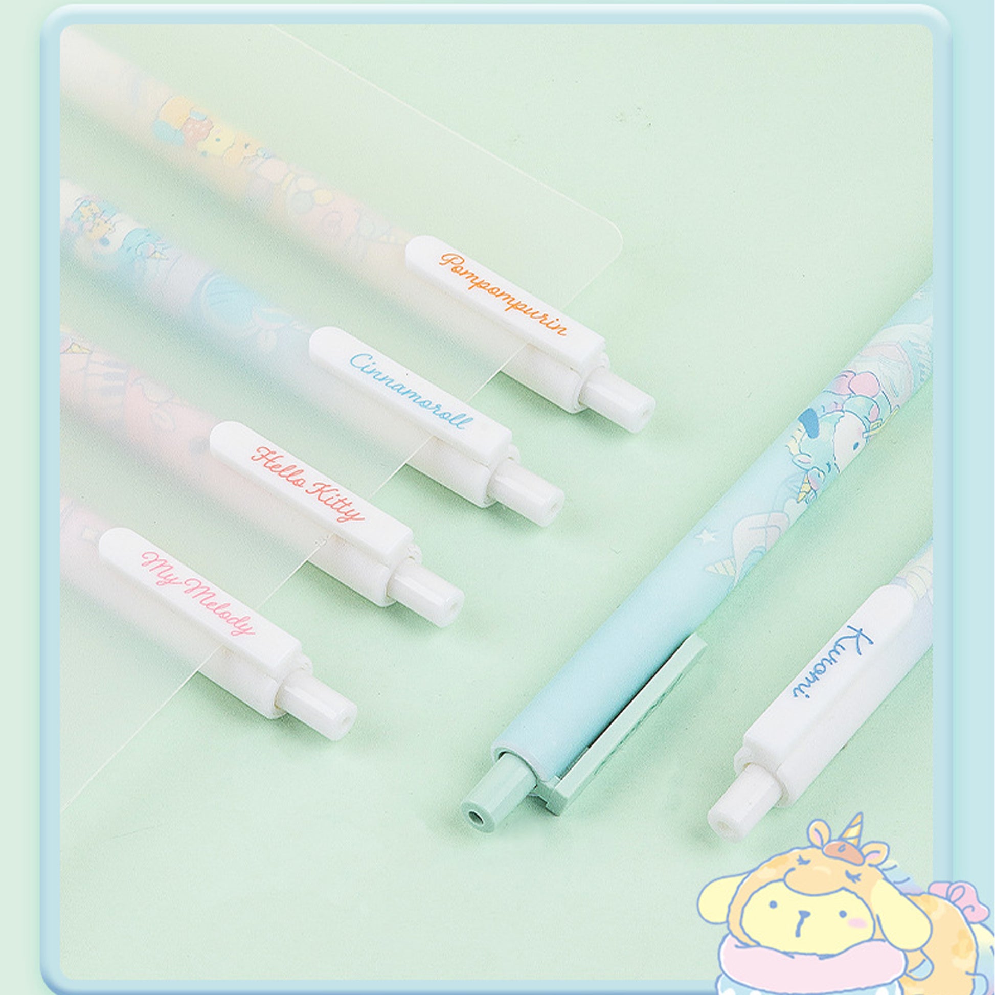 The series includes Cinnamoroll, Hello Kitty, Pochacco, Kuromi, Pompompurin, and My Melody. The blind box pens come with random characters and cannot be chosen. Each pen comes with a bookmark.