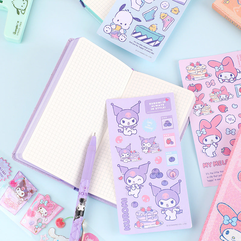 Each notebook comes with a Sanrio sticker. The notebooks feature Kuromi, Pochacco, My Melody, and Pompompurin, and are sent out randomly.